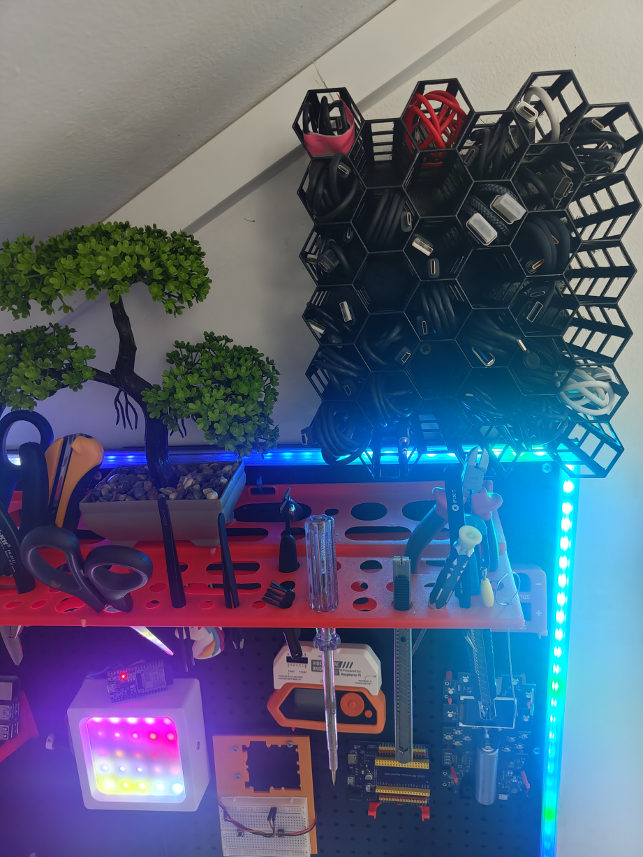 Cable Hive Organization: My desk and drawers are always a mess because of cables. I found a great cable hive on Thingiverse and got busy. Now all my cables are nicely sorted and no longer a mess.
